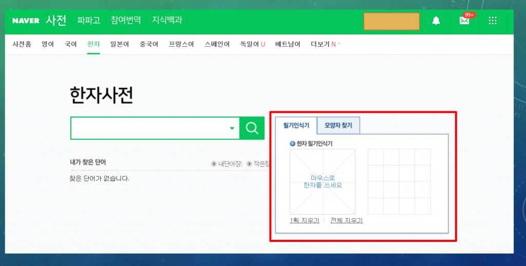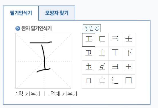 두번째, 필기 인식을 활용하기: 필기 인식 도구를 사용하여 손으로 그린 그림과 유사한 한문을 찾아줍니다. 단순한 모양의 글자인 경우 이 방법을 추천합니다.