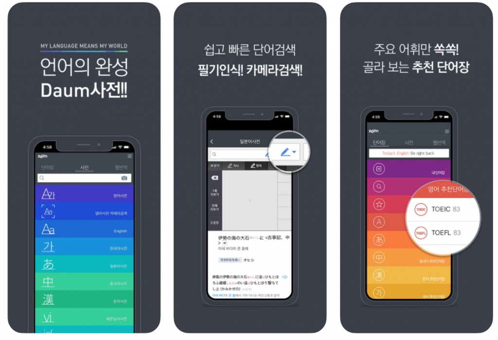 이렇게 활용하면 정보를 빠르게 확인할 수 있습니다. 그러나 모바일 시대에 더 효율적으로 이용하기 위해 다음 사전 앱을 고려해 보는 것을 추천합니다. 만약 학습용이라면 다음 사전 앱은 카메라 검색 기능을 제공하여 좀더 편리한것 같습니다.
