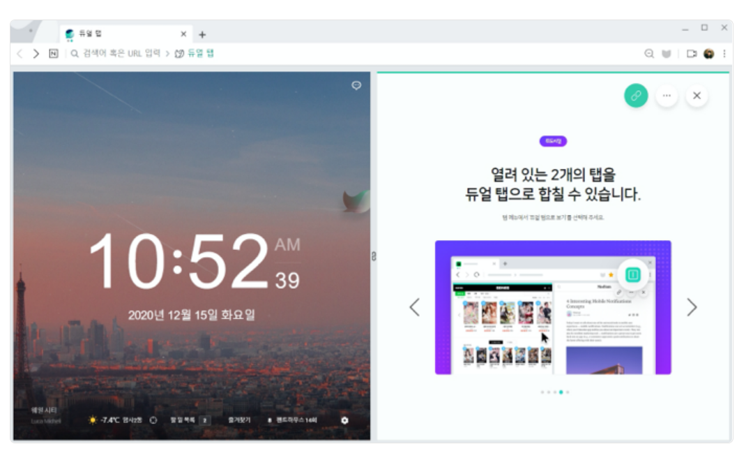 2) 네이버 이용에 편리합니다. 좌측화면에서 클릭을 하면 우측 화면에 뜨는 분할화면이 인상적입니다. 웨일 듀얼탭이라는 이름이 붙더군요.