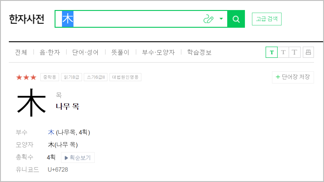 제가 자신있게 아는 한문 하나를 썼습니다. 왼쪽에 나무 목자를 쓰면 오른쪽에 AI가 판단하기에 비슷한 한자를 적어 놓습니다. 자신의 의도와 일치하는 글자를 클릭을 하시면 해당 한자의 음과 훈, 그리고 응용 등 여러가지 정보를 볼 수 있도록 되어 있습니다.