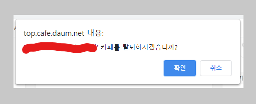 이렇게 마지막으로 팝업창이 뜨면 '확인'을 누르면 완료됩니다. 여기서 취소를 누르면 탈퇴되지 않기 때문에 주의하시길 바랍니다. 저는 한 때 많은 까페를 가입해서인지 나올곳도 많아서 이런 방법을 통해 한번에 정리했습니다.
