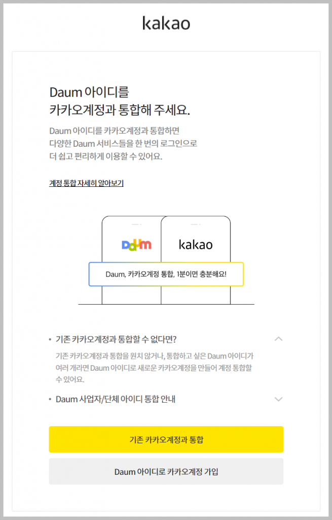 카카오에는 여러 가지 서비스가 있는데, 시스템이 두 가지가 있으니 운영하기 곤란한 점도 분명히 있었을 것입니다. 그래서 하나로 통합되는 방식으로 진행되는 것 같습니다. 서비스 이용을 위해 다음 카카오 통합하는 것을 권장하고 있습니다. 그리고 이제는 강제가 되고 있습니다.