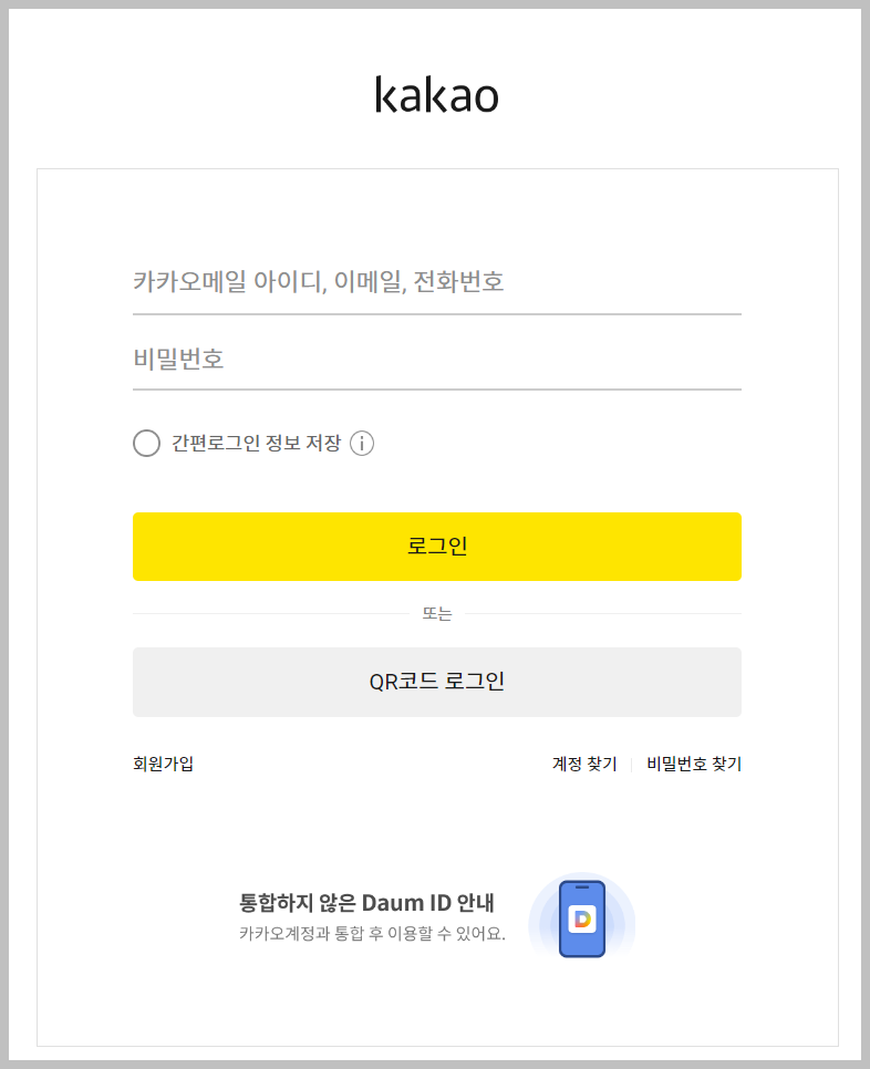 불과 몇 달 전만 해도 daum 아이디와 카카오 아이디 모두를 이용해 다음을 이용할 수 있었던 것으로 기억합니다. 그런데 요즘에는 카카오가 워낙 빠르게 바뀌기 때문에 이러한 상황도 곧 끝날 것 같습니다. 이제는 다음 아이디로 로그인이 불가능하고 카카오 또는 통합된 아이디로만 로그인할 수 있도록 변경되었습니다.