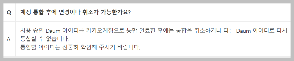 얼마 전만 해도 KAKAO 계정 통합 해제가 가능했습니다. 하지만 공지를 통해 이제 불가능하다고 되어 있네요. 내용을 보니, 사용 중인 다음 계정 통합한 다음에는 결합을 취소하거나 다른 다음 아이디로 다시 통합할 수 없다고 합니다. 그러니까 신중하게 결정하라고 하네요.