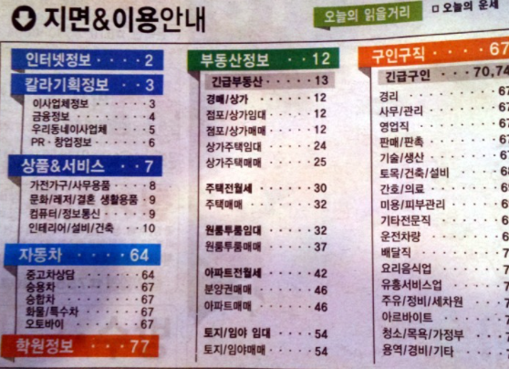 과거에는 인터넷이 없는 시절에는 종이신문의 위상이 높았습니다. 하지만 이제는 스마트폰 때문인지 위상이 예전만 못합니다. 구인구직과 관련된 내용 대형 포털 사이트로 이동한 지 오래됐습니다. 이제는 부동산과 중고차 위주의 정보가 모여 있는 것 같습니다.