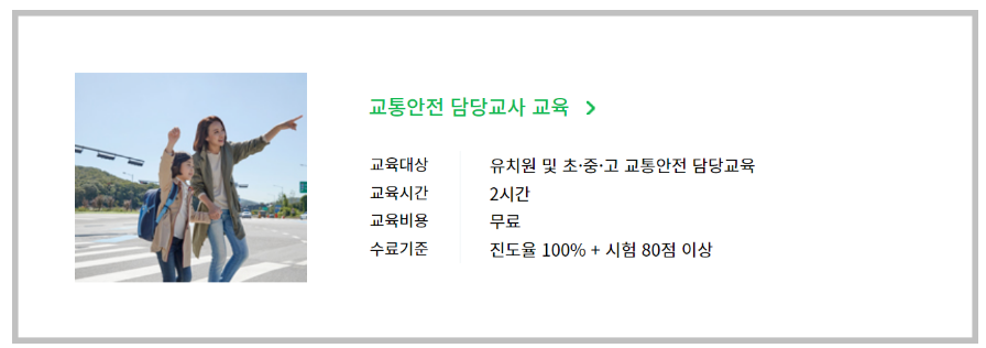 마지막으로 유치원 및 초등학교, 중학교, 고등학교에서 교통안전 교육을 진행하는 담당 교사를 위한 교육도 마련되어있습니다. 마찬가지로 2시간 가량의 교육 이후 시험 점수만 충족한다면 쉽게 수료할 수 있습니다.