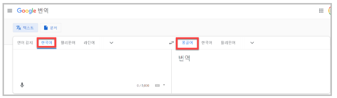 다음과 같이 위 링크를 통해 들어가면 이미 한국어와 몽골어로 설정되어있기 때문에 구글에서 제공하는 100가지의 언어중에서 힘들게 몽골어를 찾을 필요 없습니다.