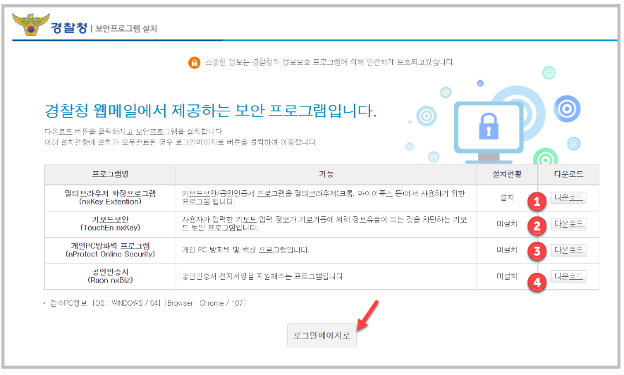 단, 공인인증서의 경우에는 인증서 로그인을 할 경우에만 필요한 것이므로 보안프로그램만 설치하고나서 로그인을 시도하는 것이 좋을 것 같습니다.