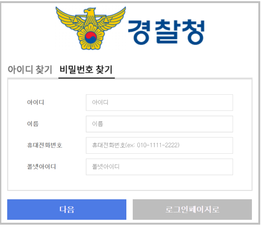 아이디와 비밀번호로 로그인을 하는 경우 가장 당황스러운 것은 아이디와 비밀번호가 틀렸을 때 입니다. 다행히 경찰청 웹메일 서비스에서는 아이디와 비밀번호 찾기를 할 수 있도록 만들어져 있습니다. 아이디와 이름 휴대전화번호, 그리고 폴넷아이디를 입력하면 비밀번호를 찾을 수 있도록 도와주고 있는 것을 확인할 수 있습니다.
