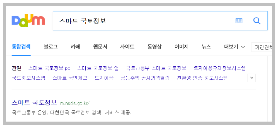 다음과 같이 네이버나 다음에 스마트 국토정보를 검색하면 국토교통부에서 제공하는 사이트를 확인할 수 있습니다.