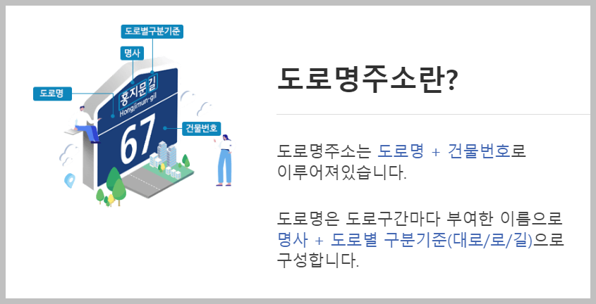 도로명은 도로명 + 건물번호로 이루어져 있습니다. 각 구간마다 부여한 이름으로 명사 + 구분기준으로 구성되지요. 좋은 시스템이지만, 우리나라의 아파트가 많은 환경을 제대로 반영하지 못한다는 비판이 있습니다. 물론 도심지를 제외한 대부분의 지역에서는 유용하다는 평가를 받고 있습니다.