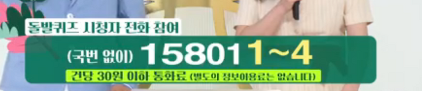ARS는 방송보면 이렇게 나옵니다. 15801+1~4 번으로 통화를 하면 됩니다. 아침마당 돌발퀴즈에 전화해보신분은 알겠지만 전화하는것만으로 응모가 완료가됩니다. 굉장히 간단합니다.