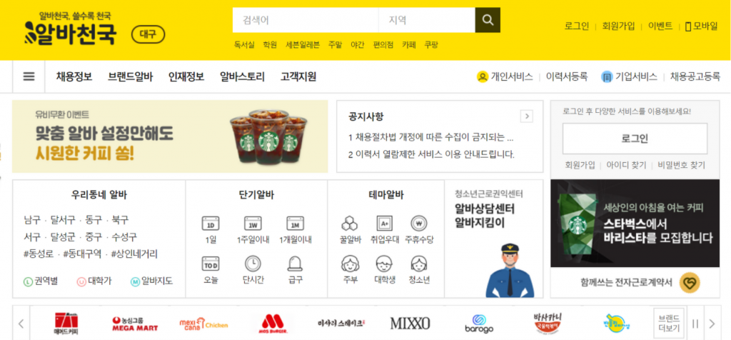 아르바이트를 많이 하는 사람들은 알바천국을 모르는 사람이 거의 없을 것 같습니다. ALBAMON과 함께, 알바천국은 우리나라의 주요한 아르바이트 중개 업체로 평가될 수 있습니다. 비록 다른 중개 플랫폼들도 존재하지만, 이 두 업체를 따라오는 사이트는 그리 많지 않은 것 같습니다.