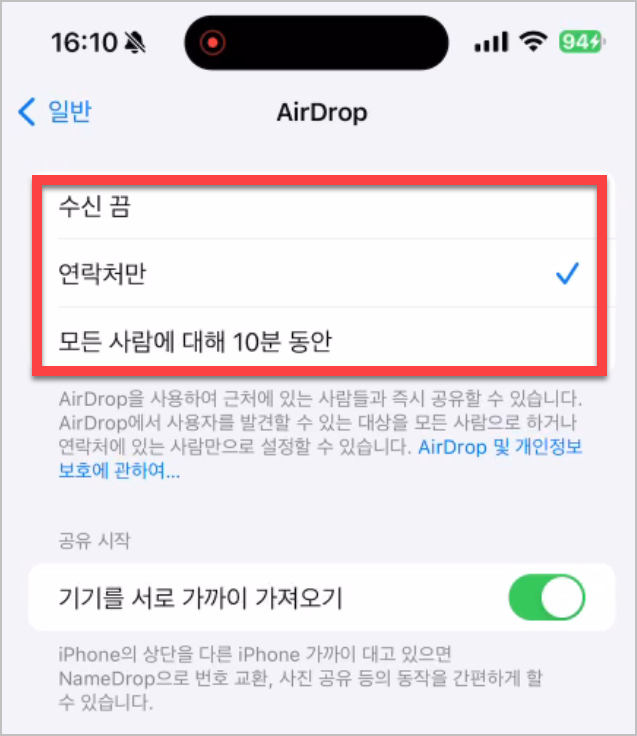 이렇게 하면 다른 사람들이 내 아이폰으로 에어드랍을 통해 파일을 보낼 수 없게 되며, 필요할 때는 같은 방법으로 다시 에어드랍 수신을 켤 수 있습니다.