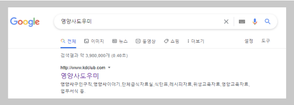 위 화면은 구글에서 '영양사 도우미'라고 검색했을 때의 결과입니다. 가장 위에 검색 결과가 표시되는 것을 확인할 수 있습니다.
