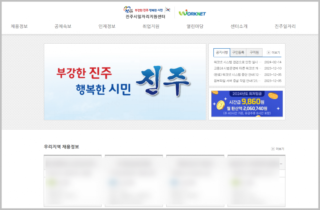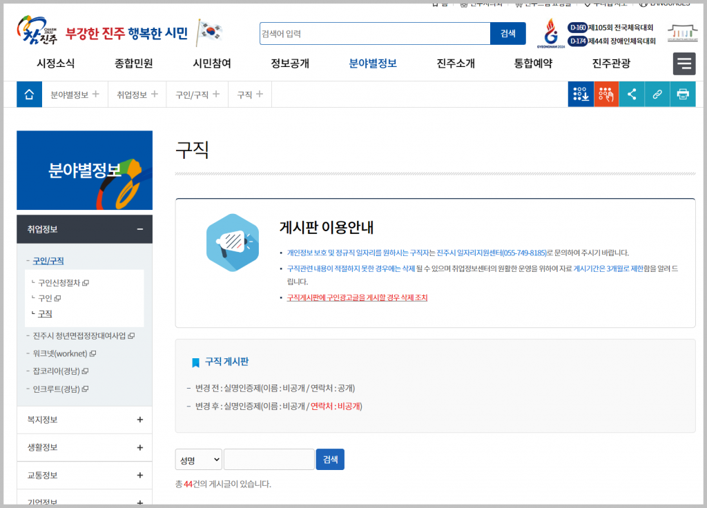홈페이지에 접속하면 위와같은 모습을 볼 수 있습니다. 이곳에서, '분야별정보' 메뉴 아래에 위치한 구인/구직 게시판은 쉽게 접근할 수 있으며, 하루에도 몇십 건의 글이 올라와 진주 지역 거주자들에게 매우 유용합니다.