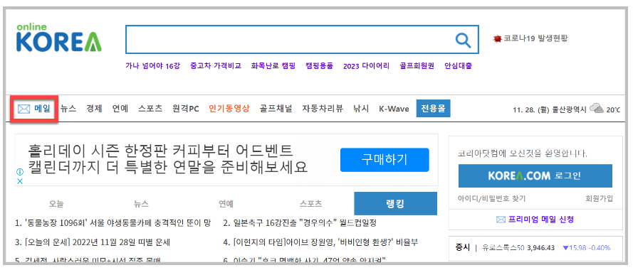 홈페이지에 접속했다면 다음과 같이 메일을 클릭하면 됩니다. 이 과정이 귀찮은 분들을 위해서 아래 링크를 남겨두겠습니다.