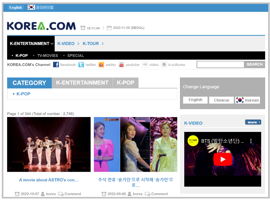 위 링크를 통해서도 접속할 수 있습니다. 링크를 통해 접속하면 다음과 같이 한류관련 내용이 가장 많은 것을 확인할 수 있고, 영어와 중국어로 사이트 번역이 가능하게끔 만들어져 있습니다. 외국에서 한류를 접하기 위한 수단으로 많이 사용되고 있는 듯 합니다. 아무래도 도메인 주소의 영향이 큰 것 같습니다.