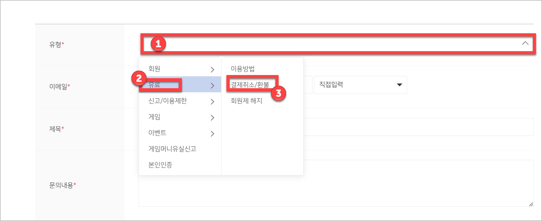3. 문의 유형에서 유료 > 결제취소/환불을 선택합니다.