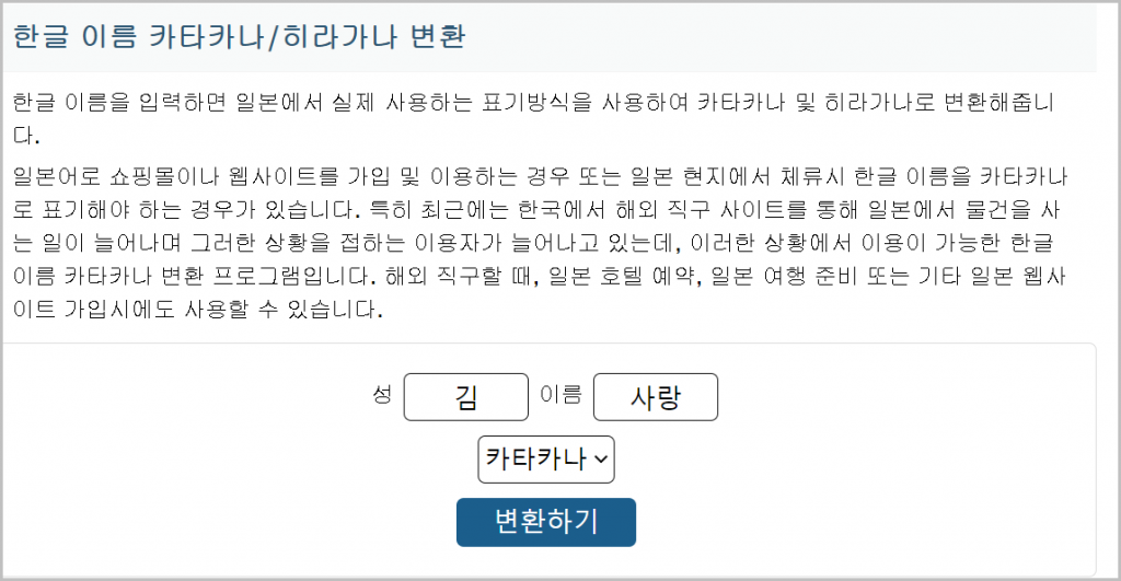 카타카나의 학습은 일본어를 배우는 학습자뿐 아니라 문화나 엔터테인먼트 산업에서도 유용하므로, 일본어 공부에도 도움이 됩니다. 한글 이름을 카타카나 또는 히라가나로 변환할 필요가 있을 때 유용하게 사용할 수 있는 사이트가 있습니다. 아래 링크를 통해 해당 페이지로 이동할 수 있습니다.