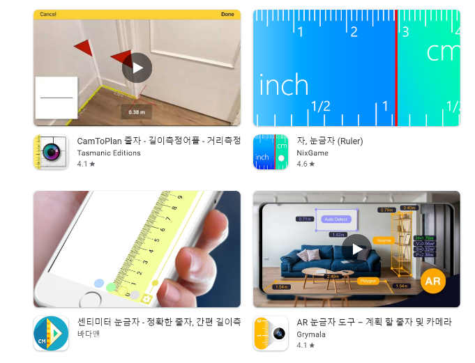 아이폰의 경우에는 기본 어플인 측정의 기능이 우수하기 때문에 별도의 앱을 설치할 필요가 없으나 안드로이드 폰의 경우에는 앱을 따로 다운받는 것을 추천합니다. 구글 플레이스토어에 들어가서 앱을 검색하면 위와 같이 많은 길이 측정 앱이 등장합니다. 이곳에서 새롭게 다운받으면 될 것 같습니다.