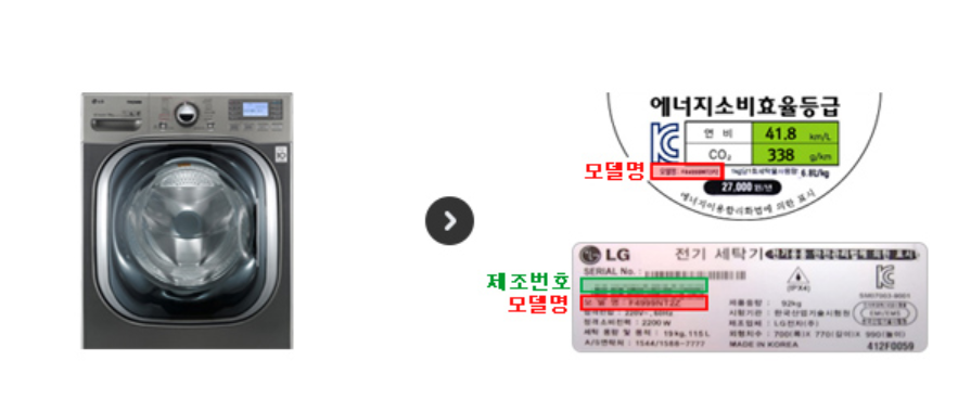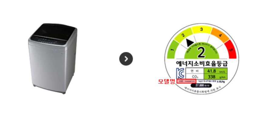 일반적인 제품의 경우, 제품 전면에 부착된 에너지 소비 효율 등급 라벨 아래에 있는 모델명을 참고하면 됩니다. 다른 것들도 비슷한 방법으로 정보를 확인할 수 있을 것으로 예상됩니다.