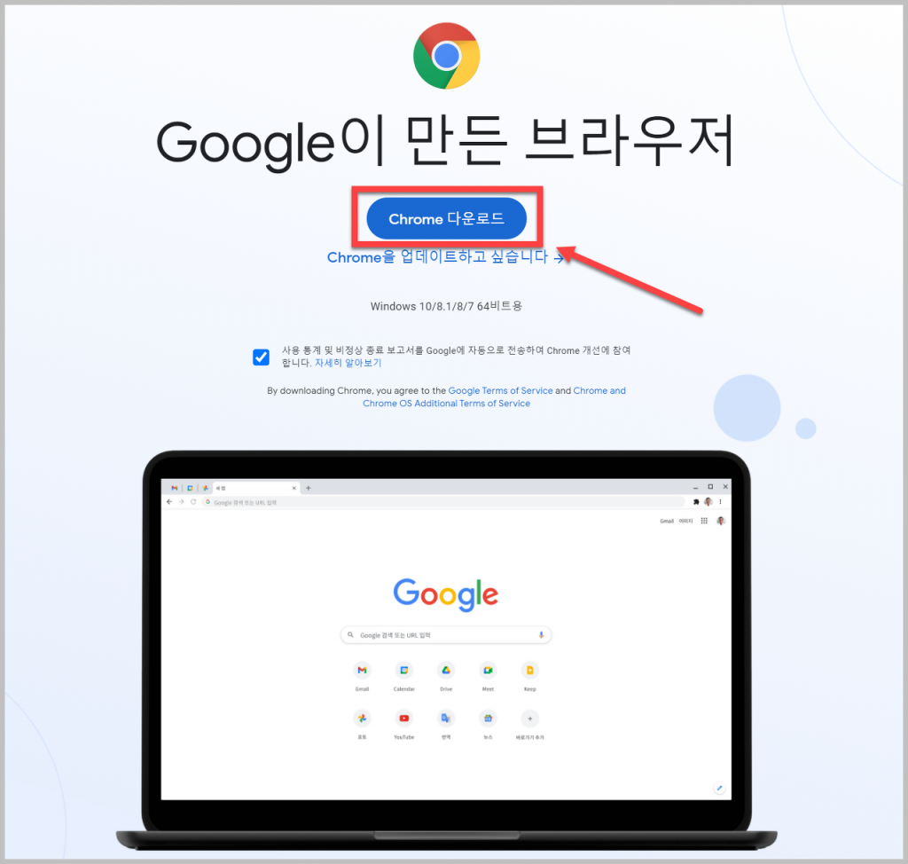위 링크를 통해 홈페이지에 접속하면 위와 같은 화면을 볼 수 있습니다. 화면 중앙부에 있는 'Chrome 다운로드'를 클릭하면 설치가 자동으로 시작됩니다.
